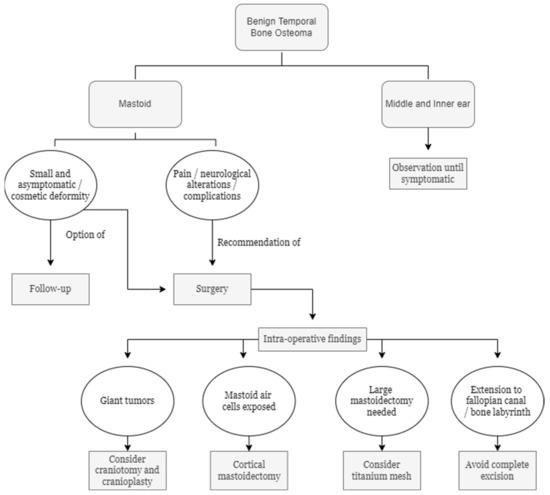 Surgery is the treatment for mastoid osteoma (Figure 4). As it is a benign lesion, every effort should be made to avoid intra- and postoperative complications. If the tumor is small, with little cosmetic deformity and no symptoms, follow-up with imaging is preferred, with the option of surgical excision. Otherwise, in the presence of pain, neurological alterations, or other complications, surgery is recommended [2,9]. Removal of superficial lesions is a simple procedure with a low risk of complications. It consists of an on-demand postauricular approach to expose the lesion and cleavage of the tumor from unaffected cortical tissue, by a bone chisel, curette, or drilling, depending on the features of the osteoma [1,7,16,17]. There is only one reported case of three-dimensional exoscope-assisted surgery of a giant lesion [19]. Craniotomy and cranioplasty may be considered for greater tumors. Exposure of mastoid air cells during the procedure prompts mastoidectomy with standard closure of the defect [7,16]. In the case of an extended mastoidectomy, reconstruction with titanium mesh can be indicated to prevent cosmetic deformity and maintain an aerated mastoid cavity [2,20]. If osteomas extend into the fallopian canal and bony labyrinth, subtotal excision is preferred to preserve these structures [12]. Osteomas involving the middle and inner ear usually do not grow, and they are treated only if become symptomatic. Likewise, auditory meatus osteomas are partially or totally removed when symptomatic by either middle cranial fossa or a suboccipital approach depending on the features of the lesion [5]. Complications of surgery are facial nerve injury, tearing of the sigmoid sinus, and postoperative discharge [2]. The recurrence rate of mastoid osteomas is very low [2,9], with only two cases of recurrence reported in the literature [13]. Malignant transformation was never reported [7,16].