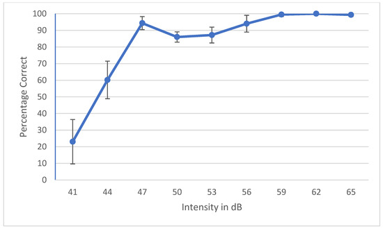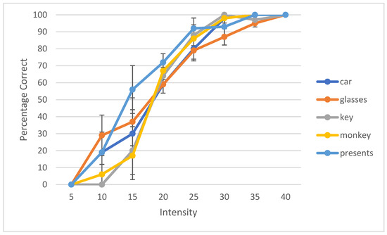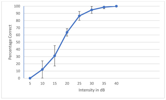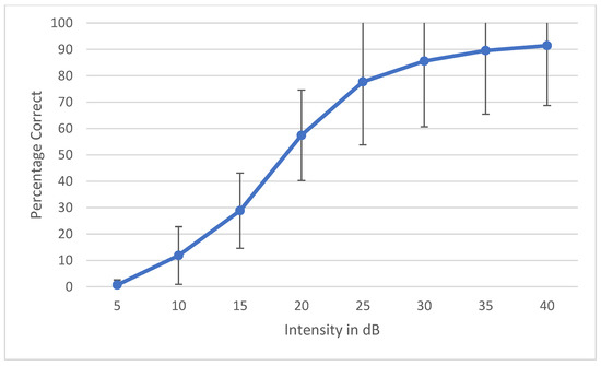 During the development of a speech audiometry test, one has to ensure that all the words are homogeneously audible. Currently, digital technology is widely used to make words equally audible, and hence, result in similar SRT results across words. Young et al. determined that the slope of each individual word should be ±1 SD of the mean to be considered homogenous [35]. Spondee words in English tend to have a steep slope due to their high audibility [36,37,38]. Research shows that the SRT materials developed in other languages have slopes of a psychometric performance-intensity function on trisyllabic words as steep as the slopes for English spondees [39]. To check the internal balancing of the 6 words, the AAST was tested on 30 adult normal hearing individuals in quiet, noise and high frequency. The results were plotted as psychometric curves, showing the relationship between the intensity sound level in the dB SPL unit on the horizontal axis against the percentage of the correct answers of adults on the vertical axis. Figure 2 shows the psychometric curve of all the six words in quiet. This confirms that the intelligibility degree of the 6 words is close and that words are not significantly easier or more difficult than each other. Figure 3, Figure 4 and Figure 5 show the average psychometric curves for the Maltese AAST words in quiet, noise and high frequency, respectively. The steepness of the slope of the AAST is 6.6%/dB in quiet, 14.3%/dB in noise and 6%/dB in high frequency.