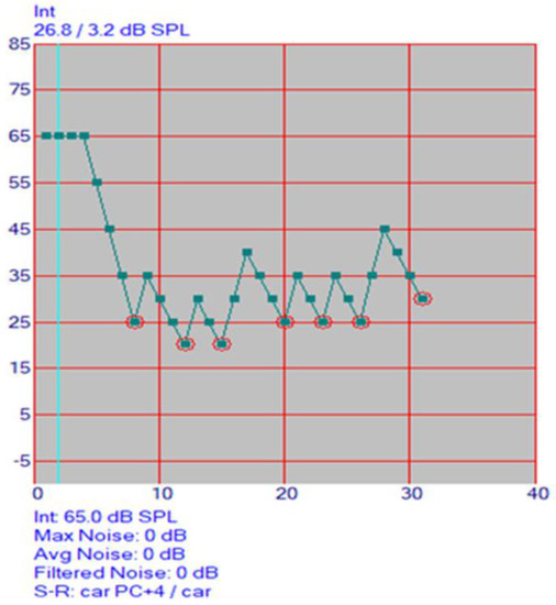 The presentation of the stimuli, the processing of the responses and the analysis were automatically carried out by the AAST program. At the beginning of the test, the level decreases in 10 dB-steps beginning from 60 dB until the first reversal occurs (incorrect or “?” input). After every correct answer, the next word is presented with 5 dB SPL lower volume. After every wrong answer, the volume is turned up by 10 dB SPL. In noise, the initial SNR is +5 dB, with the noise level at 65 dB SPL and start level of speech at 70 dB SPL. After every correct answer, the next word is presented with 3 dB SPL lower volume. After every wrong answer, the volume is turned up by 6 dB SPL. This up-down method adaptively determines the SRT in a quick and efficient manner. Figure 6 displays the audiogram proceeding. The SRT result is calculated as the mean of the presentation levels. The program stops automatically after seven incorrect answers.