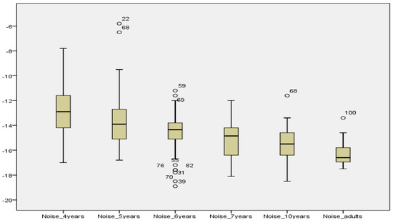 The features of SRTs in noise were relatively similar to those in quiet. The mean SRTs in noise obtained by the younger children decreased significantly between 4-year-olds and adults. The correlation between the SRTs and age in the children’s groups was estimated by a slope value of 0.5 dB per year in noise. This close correlation was also reported by Nguyen [30] with a slope value of roughly −1 dB per year.