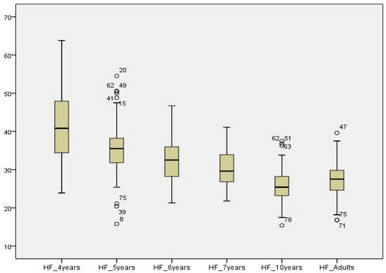 Kruskal–Wallis tests were used to compare AAST scores according to age. In all three test settings (quiet, noise and high frequency), the SRT decreased significantly between 4-year-olds and older children as shown in Table 3. In quiet and high frequency, no significant difference was reported between SRT scores in 10-year-olds and adults, showing that children at age 10 years had the same thresholds as in adults. See Figure 7, Figure 8 and Figure 9.