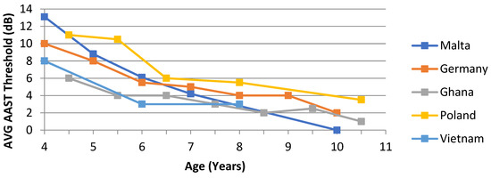 Mohammed [31] reported similar values in 5- to 7-year-olds in quiet (26.6 dB SPL) in the Arabic version. This may be due to the language similarity between Arabic and Maltese. On the other hand, Maltese thresholds are noted to be slightly better than the Vietnamese norm values [30] across all ages; the 21–30-year-old group (29.4 dB SPL), the 15–20-year-old group (30 dB SPL), 8-year-olds (31 dB SPL), 6-year-olds (31.8 dB SPL) and 4-year-olds (37.2 dB SPL). Nguyen attributed these high thresholds to the high level of background noise during testing.