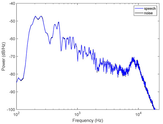 The speaker is a female voice professional with standard Flemish pronunciation. To calculate the average long-term spectrum, all utterances were concatenated into a long speech file without any pauses. The Welch’s power density spectra of the clean speech, calculated with a 2048 FFT window, is shown in Figure 1. The spectrum peaks at the fundamental frequency of 202 Hz. The figure also shows the spectrum of the speech-shaped noise. By construction, they are almost indistinguishable with an average absolute difference of 0.5 dB.