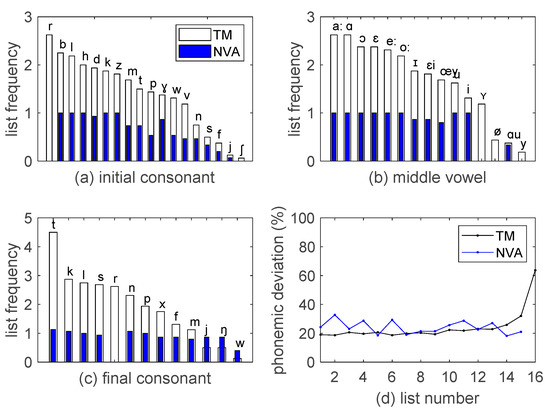 (a–c): phoneme count, averaged across lists, for initial, middle, and final position in the CVC word. (d): deviation from the target phonemic distribution for each list, expressed as a percentage.