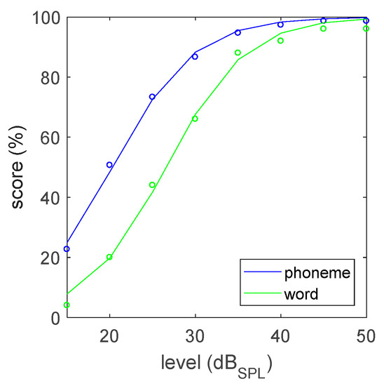 For phoneme scoring, the threshold (SRT in quiet or SRTq) and slope values are respectively 20.3 ± 1.1 dBSPL and 4.8 ± 0.3%/dB. For word scoring, they are respectively 26.6 ± 1.1 dBSPL and 4.8 ± 0.3%/dB. The margins were calculated by fitting a sigmoid for each participant, extracting the parameters and determining the 95% confidence interval. Around the SRT level, the word score curve is well approximated by the phoneme score curve shifted by 6.3 dBSPL.