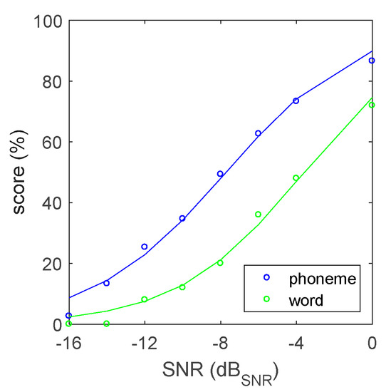 whereby the x (level or SNR) and y (phoneme or word score) variables denote the experimental data and the parameters SRT and S denote the speech recognition threshold and the maximal slope (in percentage per dB).