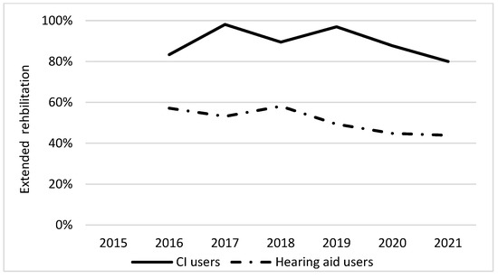 Figure 1. Proportion of cochlear implant (CI) users and hearing aid users who, at follow-up, had received extended audiological rehabilitation between 2016–2021.