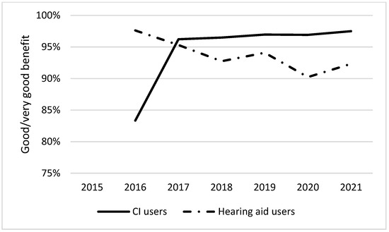 Figure 2. Proportion of cochlear implant (CI) users and hearing aid users who, at follow-up, experienced good or very good benefit of audiological rehabilitation between 2016–2021.