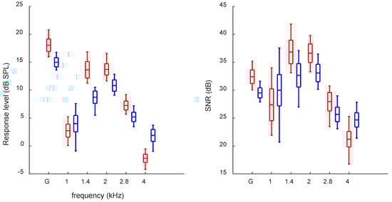 Average response levels (left panel) and SNRs (right panel) for TEOAEs without CAS measured over one year for left and right ears (blue and red, respectively). Boxes depict the mean and standard deviations, and the whiskers show the minimum and maximum. G, global (broadband).