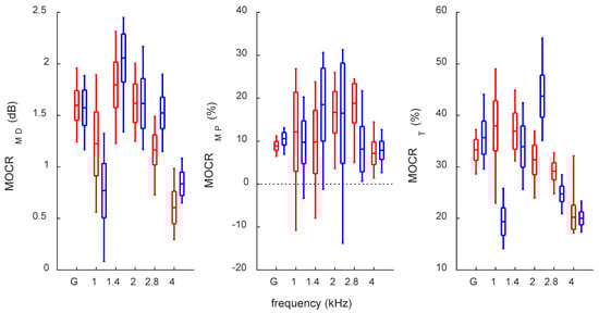 All analyses were made in Matlab (version 2018b, MathWorks, Natick, MA, USA). For latency change in MOCR, the statistical significance of mean differences was evaluated using repeated measures analysis of variance (rmANOVA). Post hoc tests were conducted using a t-test (when the data fulfilled a criterion of normality); otherwise, a Wilcoxon rank sum test was used. For some analyses, Pearson correlations also were calculated. As a criterion of significance, a 95% confidence level (p < 0.05) was chosen. When conducting multiple comparisons, p-values were adjusted using the Benjamini–Hochberg [] procedure to control for false-discovery rates.
