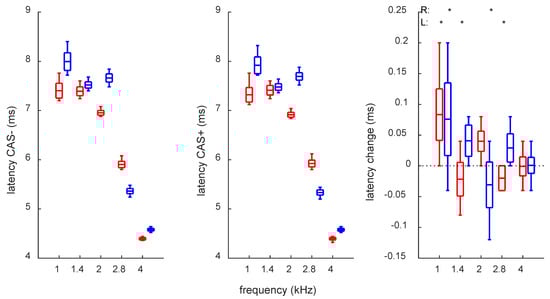 Interestingly, there was no consistent shift in both sorts of latencies (right panel of Figure 3). For some frequencies, the shift was toward shorter latencies after CAS application (1 kHz), while for other frequencies, the shift was to longer latencies. Moreover, the shift was not consistent between the ears so that sometimes, in one ear, the latency became shorter with CAS, while in the other, CAS caused latency to increase.