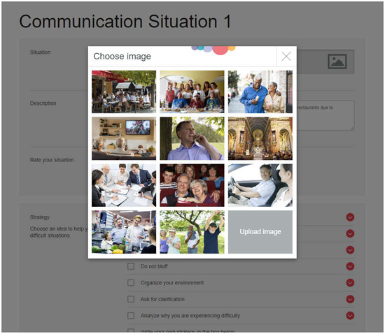 The Ida Institute’s LWT is an online tool comprising of 11 photographs depicting a variety of communication situations (e.g., a noisy environment, watching television, listening in church, participating in a meeting). Participants were asked to select a photograph depicting a communication situation they felt was most relevant, or upload an image of their own, then type a description of this communication situation and rate how difficult it was for them to communicate in this situation on a 3-point easy/medium/hard scale. Participants were then asked to select the most useful strategy to help manage their hearing loss and resultant communication difficulties in the situation from a list of eight strategies (e.g., positioning, asking for clarification, acknowledge hearing loss) or write their own strategy; and to nominate a person who will help them in the situation (e.g., friend, audiologist, spouse, other). Participants could select as many communication situations as they wanted. See Figure 1 for a sample screenshot of the LWT.