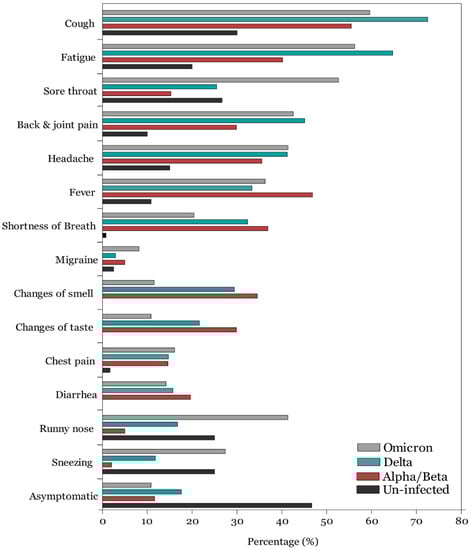 Overall, 10.82% (45/416) of COVID-19 infected individuals were asymptomatic in the omicron variant group compared to 17.65% (18/102) and 11.63% (35/301) in the delta and alpha/beta variants, respectively (Figure 1; Table S1 in Supplementary File) with no statistically significant differences among groups (p = 0.676). Among symptomatic individuals and those infected during the alpha/beta variant period, as reported in our previous study, the most frequently reported symptoms were cough, fever, fatigue, breathing difficulties, loss of smell, loss of taste, and back and joint pain. Among those infected during the delta variant, the most frequently reported symptoms were cough (72.54%), fatigue (64.71), headache (41.18%), back and joint pain (45.09%), fever (33.33%), breathing difficulties (32.35%), loss of smell (29.41%), and sore throat (25.49%). In contrast, among those infected with the omicron variant, the most frequently reported symptoms were cough (71.42%), fatigue (56.25%), sore throat (52.64), back and joint pain (42.55%), headache (41.38%), runny nose (41.34%), and sneezing (27.40%). Overall, loss of smell [OR = 0.25, 95% CI: 0.17–0.36)] and loss of taste [OR = 0.284, 95% CI: 0.19–0.42), p < 0.001] were significantly less prevalent during the omicron variant period compared to the alpha/beta and delta variants. In contrast, sore throat [OR = 6.16, 95% CI: 4.26–8.91, p < 0.001], runny nose [OR = 13.44, 95% CI: 7.72–23.40, p < 0.001], and sneezing [OR = 18.56, 95% CI: 8.04–42.84, p < 0.001] were significantly more prevalent during the omicron variant predominance period.