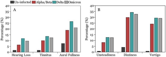 Frequency of auditory (A) and vestibular (B) symptoms among uninfected and infected participants when alpha/beta, delta, and omicron COVID-19 variants were dominant.