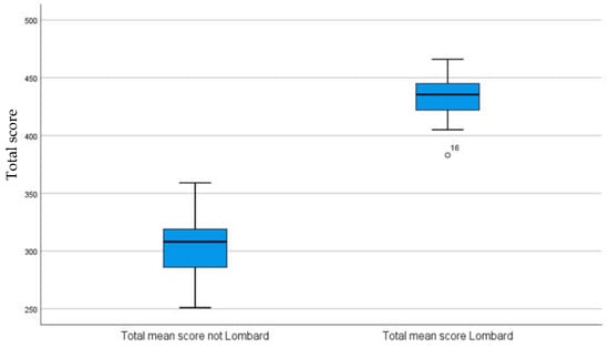 Once both blocks had been applied to the 30 participants, we looked at whether there were differences in the total score obtained in each of the lists. First, the normality of the data was analysed using the Shapiro–Wilk test and the results here showed that the scores had a normal distribution for both the block without the Lombard effect (W (30) = 0.97, p = 0.64) and the block with the Lombard effect (W (30) = 0.98, p = 0.70). Therefore, a T-test for related samples was applied, obtaining statistically significant differences with respect to the scores obtained by the subjects in both blocks of lists (t (29) = −54.20, p ≤ 0.001), the mean scores of the block with the Lombard effect (see Figure 3) being higher.