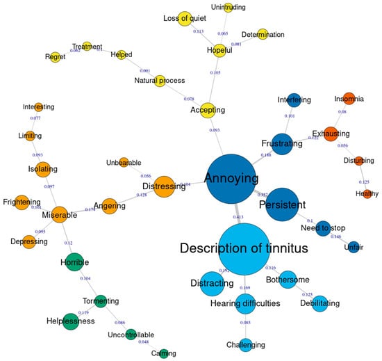 Table 2 and Table 3 provide a summary of key categories and the frequency for responses related to “tinnitus” and “health”, respectively. Using the content analysis, similar responses (i.e., words or expressions) were grouped to produce a small number of meaningful categories. The responses for “tinnitus” resulted in 39 unique categories. Out of these the most commonly occurring categories for “tinnitus” were: a term describing the nature of the tinnitus (18%), annoying (13.5%), persistent (8%), distracting (5%), and distressing (4%). The responses for health resulted in 30 unique categories. The most commonly occurring categories for “health” included: content (12%), conditions (8%), active (7%), take control (6%), overweight (5%), and distressing (4%). These frequently occurring items were also dominant in similarities analysis.