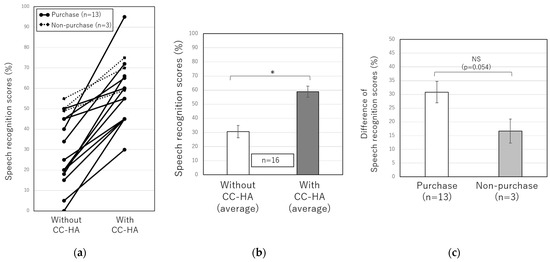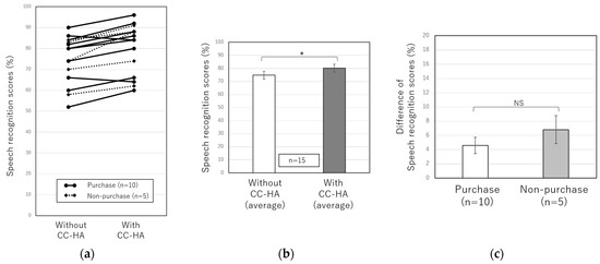 Figure 4b). However, when the 19 patients were divided into the purchase and non-purchase groups, the difference in the sound field test results with and without CC-HA was compared between the two groups, and no significant difference was observed (