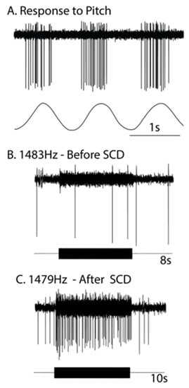 The response of the one anterior canal neuron with irregular resting discharge to high-frequency ACS (around 1480 Hz) before and after a small dehiscence was made in the bony wall of the anterior canal. (A) The response of the neuron (upper trace) to pitch angular acceleration (lower trace) identifies the neuron as being an anterior canal afferent. (B) Before SCD, an 8 s burst of 1483 Hz ACS has no effect on the resting discharge/neural response. (C) After SCD, a 10 s burst of 1479 Hz strongly activates the neuron. Note the abrupt onset and offset of that increased firing—locked to stimulus onset and offset—without a slow decrease in firing after the end of the stimulus. The firing during the stimulus is phase-locked. Reproduced from Curthoys, The New Vestibular Stimuli, Sound and Vibration Experimental Brain Research 2017, 235, p. 966, with permission of Springer Nature.
