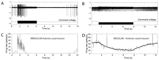 After SCD, if acoustic streaming deflects the cupula in an inhibitory direction, then all the receptor hair cells and afferents from that canal will be progressively silenced. Consequently, maintained sound or vibration stimulation will act to silence the cycle-by-cycle phase-locked activation of irregular afferents. After the cessation of the sound, the (silenced) irregular afferent gradually resumes its resting activity (A,C) as the cupula presumably slowly returns to its usual upright position because of the elastic restoring force of the cupula []. As the cupula returns, it removes the inhibitory drive on the regular (B,D) and irregular afferents, which return to their resting discharge rate. These two co-existing mechanisms—cycle-by-cycle activation and fluid flow—can work together, or they can oppose each other as these data suggest. Figure replotted from data published in [,].