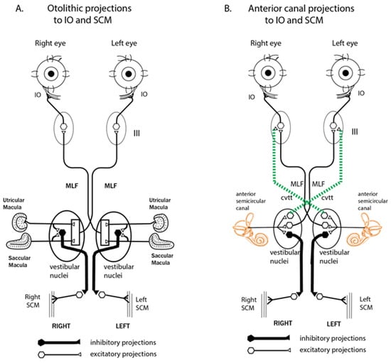 Irregular otolithic afferents arising from the striola of the utricular macula [,] are activated at low thresholds by ACS and BCV. This activation projects via the vestibular nuclei to the contralateral inferior oblique (IO) eye muscle [] and the ipsilateral SCM [] (Figure 5).