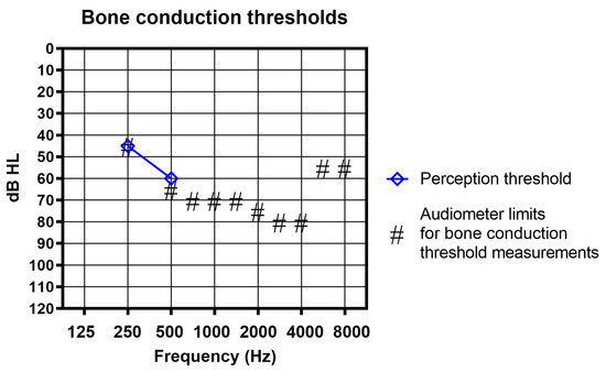 In the audiometric assessment, we found a bilaterally normal impedance audiometry and observed normal otoscopic findings, but no otoacoustic emissions could be evoked in either ear. In pure tone audiometry, no hearing was found in either ear, at any of the audiometric frequencies, and neither in the air conduction (AC) measurements (125–8000 Hz) nor in the bone conduction (BC) measurements (250–800 Hz) up to the audiometer limits, i.e., up to 120 dB HL for the AC measurements and up to 80 dB HL for BC measurements.