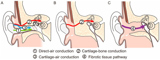 When a vibrator is attached to the aural cartilage, hearing is significantly improved compared with that in the unattached condition. This phenomenon was confirmed by using a probe microphone [6]. Previous studies have demonstrated this improvement to be significant, particularly at low to middle frequencies [6,7,8,9]. This unique form of transmission is called cartilage conduction (CC) [10]. Figure 1A shows the predominant pathways theoretically assumed in CC [11,12]. The first pathway is direct AC. The vibrator radiates sound around it, which cannot be completely eliminated. This airborne sound travels through the ear canal to drive the eardrum and the ossicles. This pathway is considered an AC pathway. The second pathway is the cartilage–BC. Vibrations are delivered to the skull bone via the aural cartilage, and the vibrations of the skull bone are transmitted to the cochlea in the same manner as in BC. Mediation by the aural cartilage could deteriorate these signals. This pathway is considered the BC pathway. The third pathway is the cartilage–AC. The delivered vibrations of the cartilaginous portion of the ear canal generate airborne sounds in the ear canal. The cartilaginous portion of the ear canal functions as a movable plate during this process [13]. This third pathway is not the predominant signaling route in either AC or BC. However, the airborne sound level in the cartilage AC is considered to be larger than that in direct AC in CC. The differences in the elevations of the thresholds with the insertion of an earplug and the injection of water into the ear canal demonstrated a significant cartilage AC function [11,12,14,15]. Previous studies have concluded that CC varies in the transduction method from AC and BC.