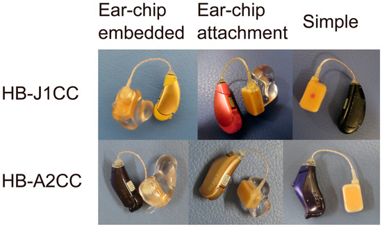 Commercially available CC hearing aids are small BTE hearing aids, which were developed based on those used in clinical studies. The main body was designed based on that used in commercially available receiver-in-canal (RIC)-style AC hearing aids. The vibrator is connected to the main body with a wire that encapsulates the electrode within. Three types of vibrator units (ear-chip embedded, ear-chip attachment, and simple) are employed (Figure 2). The size and mass of the assembled transducer are 11.9 × 7.8 × 4.7 mm and 1.4 g, respectively. This type was chosen based on the ear condition. The ear chips are custom fitted, made based on ear impressions. Instead of taking an impression of the ear, computed tomography (CT) images can also be utilized for designing the vibrator [20]. Compared to the conventional process, the merits of the design using CT images are as follows: no risks related to taking the ear impression, advantage of understanding the shape of the ear in 3D, no physical transport or shipment of an ear impression, and CT images can be sent instantly via the internet. Therefore, CC hearing aids can be created without visiting the hospital. If a CT scan is performed for diagnosis or other purposes, the images can be used without additional risk. A previous study reported that the performance of a CT-based vibrator is not significantly inferior to that of an impression-based vibrator [20]. In contrast, the simple type is available for all ear conditions and can be prepared in advance; patients can try it quickly and unnecessary ear chip costs are also reduced. However, the simple type requires double-sided tape for fixation. Among the three types, the custom-fitted type is recommended for improved stability when the cavity of the fixation placement is sufficient to hold the transducer. A previous study [21] that investigated the differences in the purchase rates demonstrated a decreased purchase rate particularly in canal-open ears when a simple vibrator was used for the trial of the CC hearing aid.