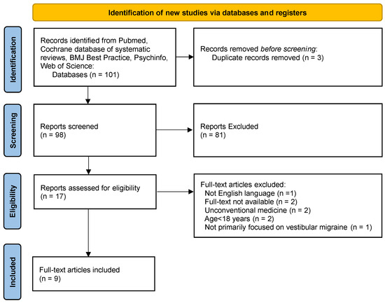 For this narrative review, we considered the most recent studies published on VM treatment. The search was performed in July 2023, and the following sources were searched: PubMed, Cochrane database of systematic reviews, BMJ Best Practice, Psychinfo and Web of Science. The following search terms were used: “Vestibular migraine” AND “treatment”, “Vestibular migraine” AND “therapy”, “Vestibular migraine” AND “prophylaxis”. We applied a filter for publication date in order to find papers published between March 2022 and July 2023. The inclusion criteria were English language and participants aged >18 years. We excluded studies on unconventional medicine or those unavailable for consultation. Our study was conducted in accordance with the Preferred Reporting Items for Systematic Reviews and Meta-Analyses (PRISMA) guidelines. Study selection is depicted in a PRISMA flow diagram (Figure 1).