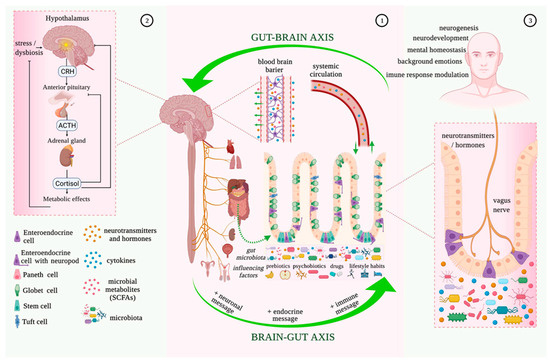 Microbiota–gut–brain bidirectional relationship. Taken from Mitrea et al. (2022) [70] under the Creative Commons Attribution License (CC BY). The use, distribution or reproduction in other forums is permitted, provided the original author(s) and the copyright owner(s) are credited and that the originalpublication in this journal is cited.