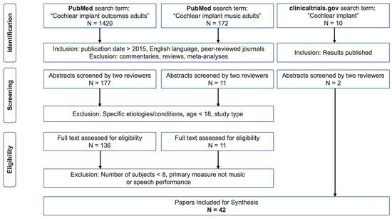 A literature search was conducted using both PubMed database and Google Scholar search engine, thus covering a broad literature source for the field of cochlear implants. We used the key words “Cochlear implant outcomes adults” (S1) as well as “Cochlear implant music adults” (S2) in March 2022. The review protocol was not pre-registered. An initial search found that Google Scholar showed less relevant publication titles when compared to PubMed, and the publications found in the former matched those found in PubMed. In addition, we searched the clinicaltrials.gov database, which provides information on funded clinical trials around the world, using the search term “Cochlear Implant” (S3) in March 2022. We cross-checked the findings with the first 200 papers on Google Scholar. Figure 1 describes our screening procedure.