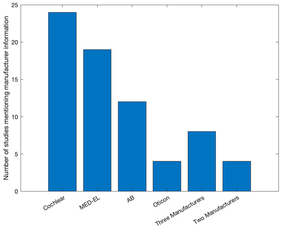 The bar plot shows the number of studies identified for each CI manufacturer and when 2 or 3 manufacturers were mentioned.