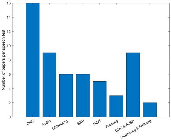 Different types of speech and music performance tests were used to determine post-operative outcomes. Thirty-three studies reported only speech outcomes, three studies performed both speech and music tests, and nine studies reported only music tests. The assessment tool(s) used in these publications pertaining only to music varied greatly. Six studies used surveys, questionnaires, and quality of life measures to assess performance. Four studies used music samples, music bursts, instrument identification, timbre, and intonation identification to assess outcomes. Two studies reported outcomes using validated music tests, specifically the Musical Sound Quality Impairments in Cochlear Implants (MUSHRA, Johns Hopkins University) and the Musical Sounds in Cochlear Implants perception test (MuSIC, Technical University Munich). Additional outcome assessment tools included objective measures and vocoded stimuli, i.e., synthesized signals that are thought to simulate, for a normal-hearing listener, the perception of speech as heard through a cochlear implant. In addition to a wide variety of outcome measures, we also found the aims of these studies were quite diverse, like the studies on speech perception outcomes ranged from assessing quality and enjoyment of sound to evaluating the impact of an online music training program. We found that most studies reported speech perception outcomes using the CNC word recognition test (n = 16), with AzBio, a sentence list test, mentioned in nine studies (see Figure 3). In addition, 94% of all speech performance tests were conducted under noise conditions.