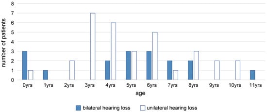 The presence of a history of HA use was not observed in cases of unilateral hearing loss, and it was only observed in five of the 17 cases of bilateral hearing loss (BC-HA: two cases at the ages of 6 and 7 years, unilateral-AC-HA: one case at the age of 5 years).