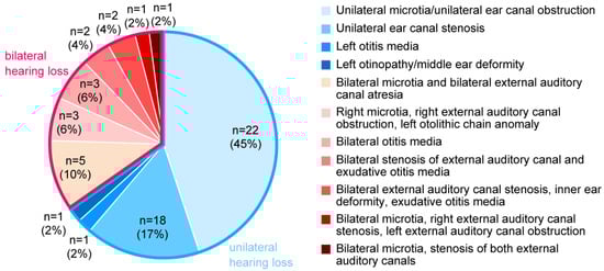 Among the participants with bilateral hearing loss, eight had conductive hearing loss, eight had mixed hearing loss, and one participant could not undergo bone conductometry. Among the participants with unilateral hearing loss, 29 had conductive hearing loss, one had mixed hearing loss, and two could not undergo bone conductometry. Among the participants with bilateral hearing loss, two had chromosome 21 trisomy, and the remaining participants each had Treacher Collins syndrome, chromosome 18 trisomy, FOXP1 syndrome, and Primrose syndrome.
