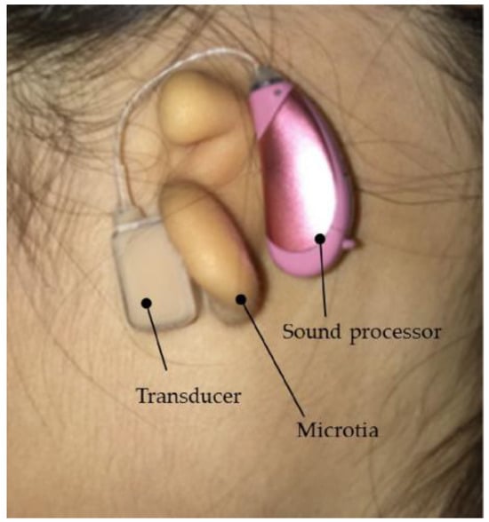 Profile view (left side) of a patient with congenital external ear canal atresia fitted with a cartilage conduction hearing aid (CC-HA). The transducer and sound processor components of the CC-HA (HB-J1CC, RION Co., LTD.; Tokyo, Japan) are attached to the skin using a double-sided adhesive tape.