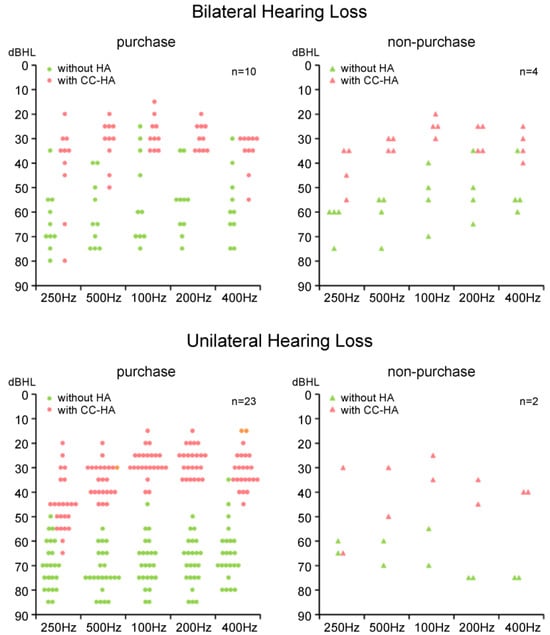 Average unaided and aided sound field hearing thresholds in bilateral and unilateral hearing loss of participants in purchase and non-purchase groups. The dots on this graph represent the raw data for each frequency for each case.