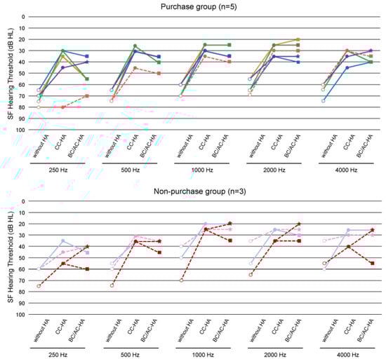 Hearing aids other than the CC-HA, that is, the BC-HA or AC-HA, could only be auditioned in the binaural hearing loss group. Of the cases with this comparative hearing loss, the SF thresholds for each HA were measured in eight cases (five with the CC-HAs and three without it). All these patients had better thresholds with the CC-HA than without HAs, with the CC-HA being better than or equal to other HAs in all cases except for one in the non-purchased group (Figure 9). The AC-HA was not available in all cases in the unilateral hearing loss group, and only BC-HA was indicated; however, none of the cases were auditioned due to reluctance to use a catheter-type headset or crimp the bone-conducting terminal.
