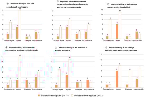 Regarding the effectiveness of wearing, among the statements “noticed voices from behind more easily”, “easier understanding of conversations in noisy places, such as parks or restaurants”, “better understanding of the direction of sounds and voices”, and “easier understanding of conversations with multiple people”, participants with bilateral hearing loss and unilateral hearing loss responded with “strongly agree” or “agree” in over 50% of the cases (Figure 10). However, for “conversations with multiple people”, the agreement rate was low. This tendency was particularly pronounced in patients with unilateral hearing loss.