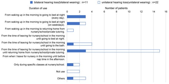 Among the 22 participants with unilateral hearing loss, one participant reported wearing CC-HA from “morning, upon waking up” to “night, before going to bed”, one participant reported wearing CC-HA until “returning home”, and the majority of 15 participants (68.2%) reported wearing CC-HAs from “when going to nursery school/school” to “returning home”. One participant reported wearing CC-HA “only at nursery school/school” and the remaining four participants reported wearing CC-HAs only when spoken to (Figure 11).