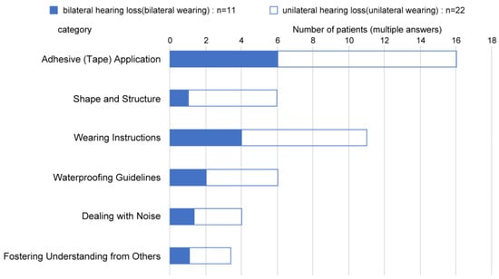 The requests for HA usage were classified into six categories (n = 46): “concerns regarding adhesives (tape)”, “issues with wearing and handling”, “concerns regarding shape and structure”, “waterproofing concerns”, “concerns regarding background noise”, and “concerns regarding social acceptance”. Among these categories, “concerns regarding adhesives (tape)” were the most common (34.8%), with noticeable responses indicating that the tape tended to become less adhesive over time, owing to sweat. The second most common category was “issues with wearing and handling”, accounting for 23.9% of the responses, with difficulties mentioned in children independently using and putting on the device (Figure 12).