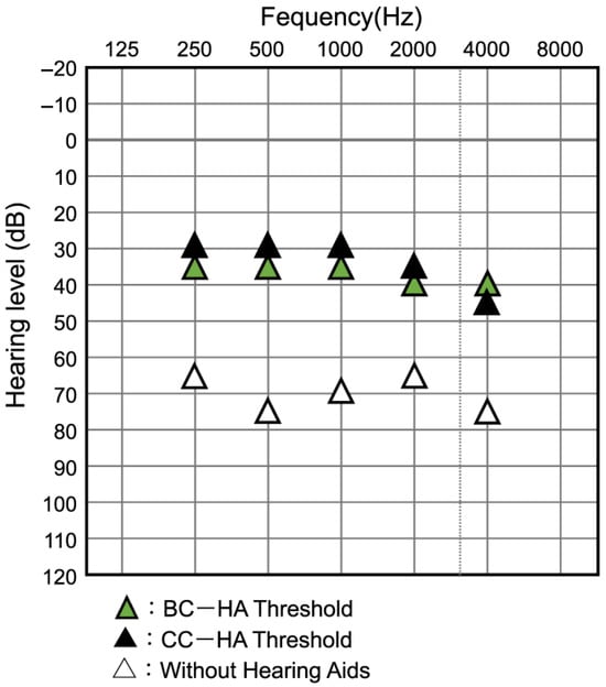 Auditory thresholds were assessed by an experienced audiologist in a standard soundproof room using a commercially available audiometer (Model AA-HI, RION Co., LTD., Tokyo, Japan). Pure-tone thresholds were determined using over-ear headphones (125 Hz to 8 kHz) to assess the air conductance thresholds and a calibrated bone-conducting transducer (500 Hz to 4 kHz) to assess the bone conductance thresholds. The sound field (SF) thresholds were evaluated to assess the effects of the CC-HAs. Complementary and non-complementary hearing thresholds were assessed by introducing an azimuthal angle of 0° and transmitting warble tones from a loudspeaker positioned 1 m away from the participant. As the CC-HAs were fitted on only one side in participants with unilateral hearing loss, noise masking was provided to the other ear through headphones such that the test tone could not be heard. The complementary hearing threshold for CC-HAs could not be accurately assessed in participants with unilateral hearing loss; therefore, the hearing threshold was used as the reference value. Behavioral hearing tests, such as behavioral observation audiometry (BOA) and visual reinforcement audiometry (VRA) were used to assess the hearing ability if the participant was too young to undergo the hearing tests described above. Behavioral hearing tests were performed in a manner similar to those used in previous reports from Japan [20].
