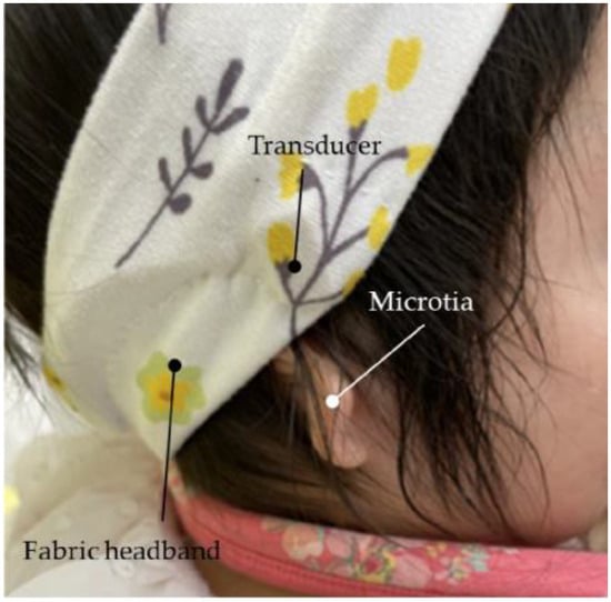 Case 2 was of a child aged 1 year and 11 months who was born at 38 weeks of gestation and weighed 2398 g. Chromosomal abnormalities (chromosomes 18 and 3) and FOX P1 syndrome were identified. The patient is currently receiving education at a municipal development facility. Significant stenosis was observed in both the external auditory canals during the initial visits at the age of 1 year and 1 month. The possibility of conductive hearing loss was indicated by the auditory steady-state response (ASSR). Following the experience in Case 1, the HA was attached to a commercially available cloth headband, with the transducer placed outside the band for testing purposes (Figure 17). By the age of 1 year and 2 months, the child could wear the HA for approximately 6 h a day, and the mother reported improved sound responsiveness with fewer instances of howling. As the child could remove the headband from the age of approximately 1 year and 5 months, the mother started attaching the main body and transducer directly to the skin for wearing. Currently, for safety reasons, the shoulder area is secured with a short strap, and an HA is used without a headband for a few hours daily (Figure 18). The parents are considering using ear tips in the future.