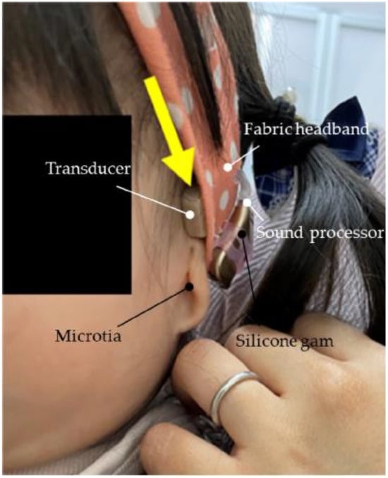 Profile view (left side) of Case 1 (a patient who is over 1 year old with Treacher Collins syndrome with bilateral external auditory canal stenosis and exudative otitis media) using cartilage-conducting hearing aid. The hearing aid is sewn to the headband, the transducer is placed outside the headband, and the transducer is attached with double-sided tape near the ear-pearl cartilage (Yellow arrow indicate the transducer peeking through the headband).