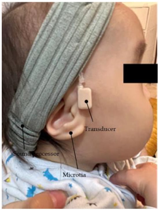 Treacher Collins syndrome (as seen in Case 1), also known as mandibulofacial dysostosis, is an autosomal dominant inherited genetic disorder with an incidence of 1 in 50,000 [27,28]. Common symptoms of this syndrome include hypoplasia of the facial bones, especially the mandible and zygoma, drooping of the cleft palate, lid coloboma, and cleft palate [29]. Conductive hearing loss is observed in 50% of patients and is attributed to malformations of the outer and middle ear [30,31]. Previous studies have reported on auditory rehabilitation in patients using the BC-HAs or BAHAs. The importance of early auditory rehabilitation to ensure the appropriate development of language and learning is well-known [32,33,34,35]; however, the use of BC-HAs is associated with local pain, discomfort, and concerns related to appearance [8,10]. BAHAs require surgery [36,37] and implant protrusion is disadvantageous in terms of appearance [8]. In contrast, the use of CC-HAs is not associated with these problems and is considered an effective alternative to AC-HAs. In this study, a headband was used as an adaptation to the device. Initially, concerns were raised regarding headband shifting; however, no issues were encountered during the study period. Factors such as the child being calm, having minimal body movements during infancy or other life stages, or being at a stage of greater understanding may also have influenced the results.