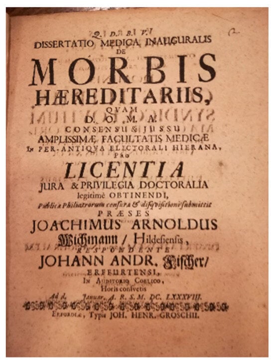 While most of the research was in the botanic field, among the Hereditarists there was also attention paid to human pathologies. In 1751, Pierre-Louis Moreau de Maupertuis (1698–1759) used the statistical analysis of the recurring polydactyly in the Ruhe family to demonstrate that (a) the phenomenon was not random but referred to a biological mechanism of character transmission that was still unknown; (b) the malformation was transmitted both maternally and paternally. The Preformationism idea was therefore amiss, in the ovistic and animalculistic versions. De Maupertuis suggested that the inheritance of characteristics was bound to “particles” in both germ cells. These particles would be responsible for the formation of different organs and structures in the baby []. Only in the second half of the 17th century hereditary diseases became the focus of some attention (see the Dissertatio Medica Inauguralis ‘Morbis Haereditariis’ by Johann Andreas Fischer at the Medical Faculty of Erfurt, January 1688. Frontispiece in Figure 1).