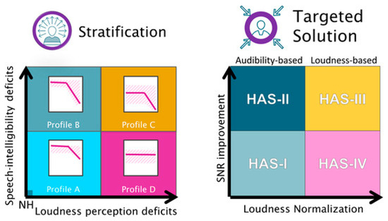 Illustration of the profile-based HA-fitting strategy. (Left): Summary of the auditory profiling results. In a two-dimensional space with speech intelligibility (SI)-related deficits on the y-axis and loudness perception (LP)-related deficits on the x-axis, listeners differing in the degree of these two types of deficits are placed at different positions along the two dimensions. (Right): Hearing aid settings (HAS) for the different profiles, which are intended to compensate for the specific auditory deficits. Signal-to-noise ratio (SNR) improvement as a solution for SI deficits and loudness normalization as a solution for LP deficits [12].