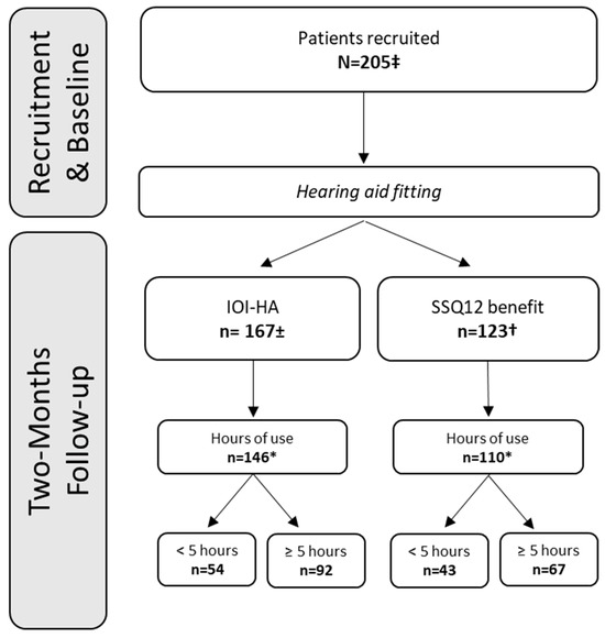 Number of respondents for the IOI-HA and SSQ12-B questionnaires. ±: Mean PTA across 0.5, 1, 2, and 4 kHz = 32.2 dB HL, SD = 6.5 dB HL. †: Mean PTA across 0.5, 1, 2, and 4 kHz = 33.0 dB HL, SD = 7.7 dB HL. *: Data-logging information available. ‡: Reference fitting group, N = 105; BEAR fitting group, N = 100.