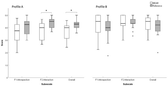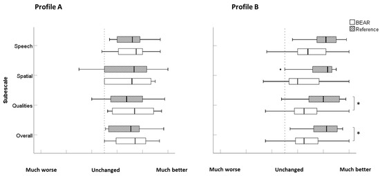 Boxplots of SSQ12-B scores for profiles (A,B) and the reference and BEAR fittings. Profile (A): BEAR (N = 12), reference (N = 9). Profile (B): BEAR (N = 21), reference (N = 19). Asterisks represent statistically significant differences (p < 0.05).