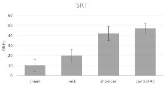 Following this, the effect of the different stimulus frequencies was also assessed. A significant effect at the three stimulus sites was found: cheek (F (4) = 12.82, p < 0.001), neck (F (4) = 40.82, p < 0.001), shoulder (F (4) = 14.55, p < 0.001). There was no significant difference in the air control between the different stimuli thresholds. Post hoc analysis (Scheffe) revealed a difference between the lower frequencies, 500 Hz and 1k Hz (lower—better thresholds), and the thresholds for the higher frequencies, 2k Hz and 4k Hz, and the SRT.