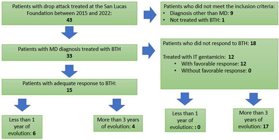 In a thorough review of the database of patients treated at the San Lucas Foundation between 2015 and 2022, 43 patients with a diagnosis of drop attack were found. All of them underwent neuroimaging (MRI), EKG and cardiologic exams to rule out any other cause that is not MD, pursuant to the diagnostic criteria published by Bárány Society. Ten were excluded, as they did not meet the inclusion criteria for this study. (Nine presented drop attacks of idiopathic etiology, and one patient had not adequately completed the treatment with betahistine.) Therefore, the study population was made up of 33 patients who presented drop attacks of vestibular origin with a diagnosis of Ménière’s disease, all of whom were treated with betahistine, and a clinical follow-up of at least 1 year was performed. As shown in Figure 1, 15 patients had an adequate response to BTH; in this group, 6 of them had less than 1 year of duration of MD, while 4 of them had more than 3 years of duration. As for the 18 patients who did not respond to BTH, it should be noted that none of them had less than 1 year of duration, and almost the whole group (17 patients) presented disease that had progressed for more than 3 years. It is important to point out that, in this last group, and given the lack of response to BTH, 12 patients were treated with intratympanic gentamicin (we use doses of 30 mg), with a success rate of 100% with one or several applications; these patients received a clinical follow-up of at least 2 years.